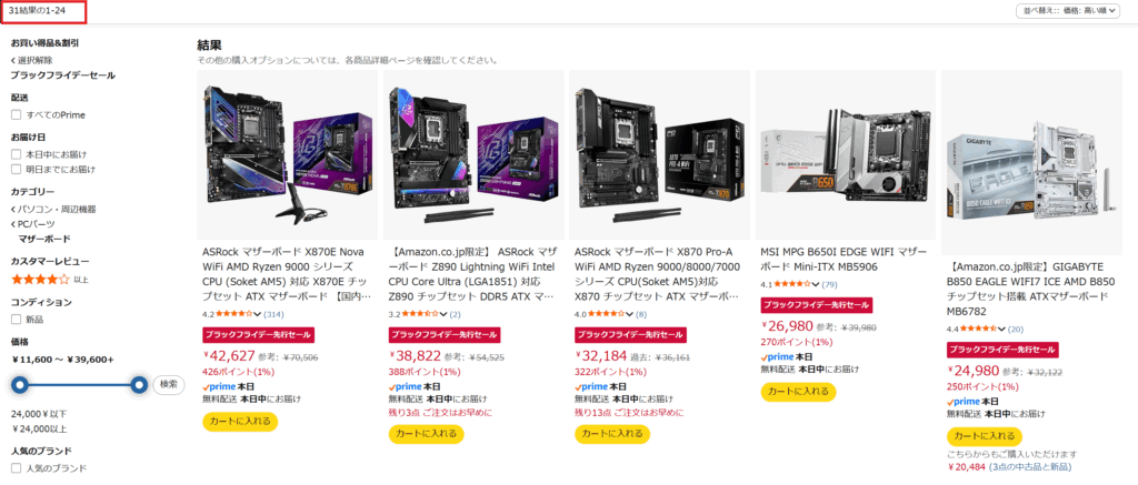 マザーボードに関してはセール対象が最新鋭のソケットAM5やLGA1851に加え、AM4やLGA 1700と種類が豊富ですのでセール会場を直接確認することをおすすめします。