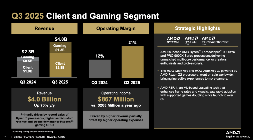 AMDによると、この成長の主な要因はRyzen 9000シリーズを中心とするクライアント向けCPUの人気です。加えて、ROG Xbox Ally Xなどに搭載されるカスタムAPUも売上高拡大に大きく貢献しています。