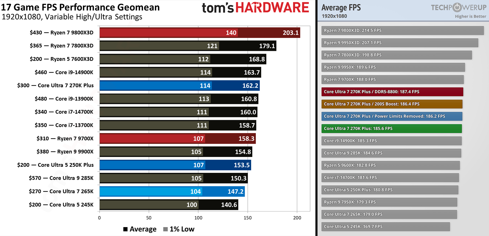一方、AMDのRyzen 7 9800X3DやRyzen 7 9850X3Dに対しては依然として差があり、Tom's Hardwareの計測では9800X3Dに対して約20%劣る結果となっています。ただし、Ryzen 7 9800X3Dは$130〜180ほど高価であるため、コストパフォーマンスの観点ではCore Ultra 7 270K Plusに分があります。