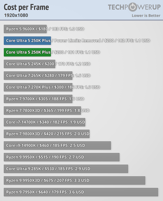 ゲーミング性能も先代の245Kから6〜12%ほど向上しており、Core i7-14700KやRyzen 5 9600Xと同等の水準に達しています。$199(約3万円)という価格を考慮すると、エントリー〜ミドル帯でのコストパフォーマンスは非常に高いといえます。