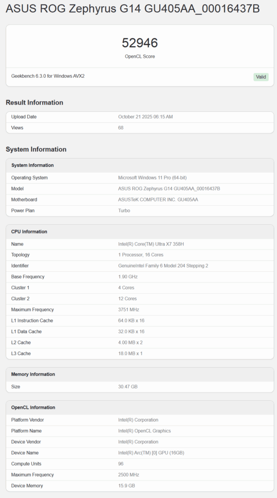Geekbench 6に掲載されたベンチマーク結果は、ASUSのROG Zephyrus G14「GU405AA_00016437B」に搭載されたCore Ultra X7 358Hのものとなっています。
