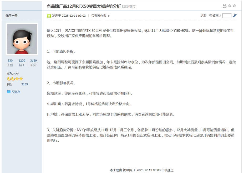 博板堂に書き込まれた情報でも、この減少幅は通常の季節的な変動をはるかに超えているようです。NVIDIAやAIB側のサプライチェーンで何らかの問題または調整が行われていると見られています。