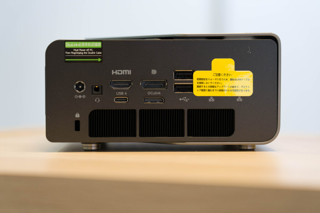背面のインターフェイス類はUSB Gen3.2に対応するType-Aポートが2つとDisplay Port 1.4とHDMI 2.0、Oculink(PCIe Gen4 x 4)、USB 4をそれぞれ1ポート、そして2.5Gbps対応のイーサネットを2ポート搭載しています。