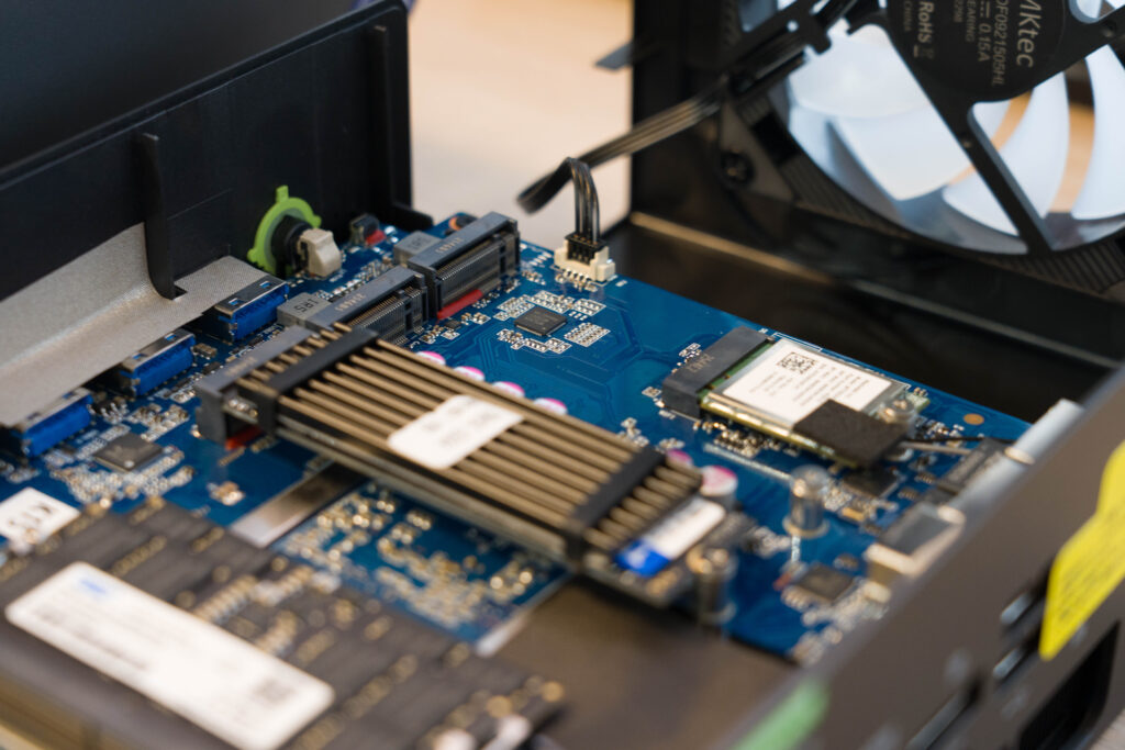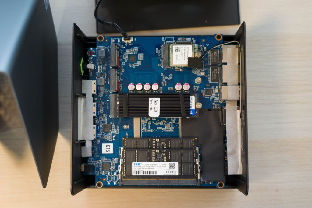 なお、内部はPCIe Gen 4 NVMe SSDに対応するM.2スロットが3本あり、すべて2280タイプに対応しています。そのため、4TBのNVMe SSDを使えば最大12TBまでストレージを追加できます。また、SO-DIMM DDR5も簡単にアクセスできるところにレイアウトされているため、拡張性はかなり高めになっています。