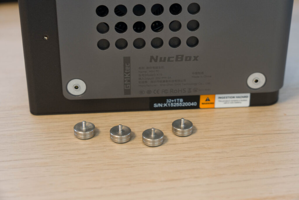 最初のステップである底面に備わる足はネジになっているため、回すと取れます。他のミニPCではゴム足部分が糊で付けられているため、何度も取り外すと自然に落ちると言った懸念がありますが、この構造の場合、そのような心配はありません。