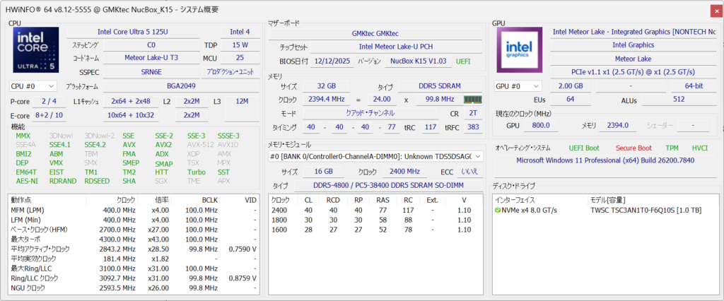 GMKTec K15に備わるCPUはIntelのMeteor Lake世代にあたるCore Ultra 5 125Uになっています。このCPUは2P+8E+2LPEの合計12コア構成のCPUになっています。