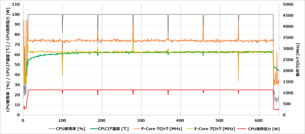温度に関しては60℃前後で推移するなどかなり低めになっています。これはK15に使われている筐体デザインは80Wで動作するArrow Lake世代のCore Ultra 9 285Hを搭載するEVO-T1と同じであることから排熱に余裕があると言え、実際にベンチマーク時のファンノイズもほとんど聞こえないなど余裕があることが伺える結果になっています。