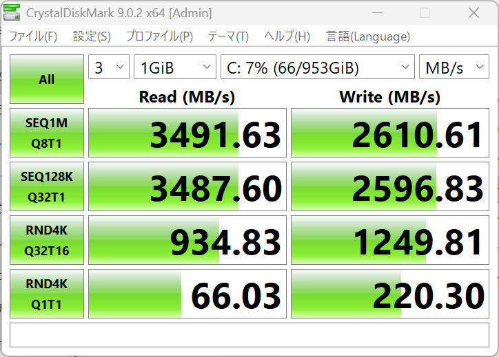 内蔵されているSSDはTWSC TSC3AN1T0-F6Q10Sと呼ばれるPCIe Gen 4対応の1TB NVMe SSDを搭載しています。このSSDの公称値は不明ですが、読み取り性能が約3500MB/s、書き込み性能が2600MB/s程度で特に不自由がある性能ではありません。