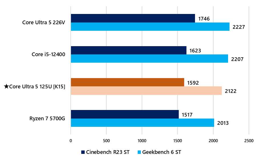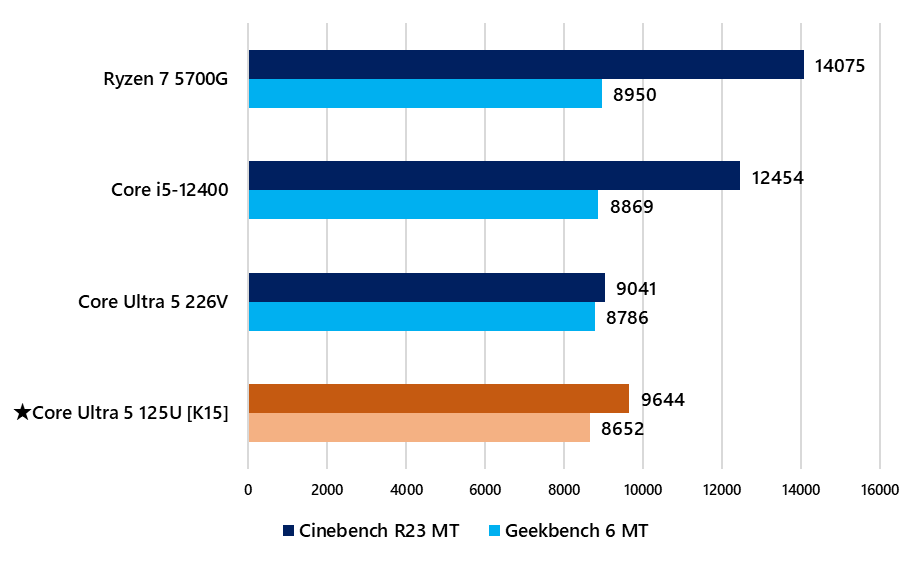 K15に搭載されるCore Ultra 5 125Uのシングルコア性能についてはCinebench R23で1592pt、Geekbench 6で2122ptを記録しており、デスクトップ向けのCore i5-12400とほぼ同等の水準に達しています。Ryzen 7 5700Gに対してはこれを上回っており、TDP 15Wのモバイル向けプロセッサーでありながらデスクトップ向けCPUに迫る、あるいは超える場面がある結果です。