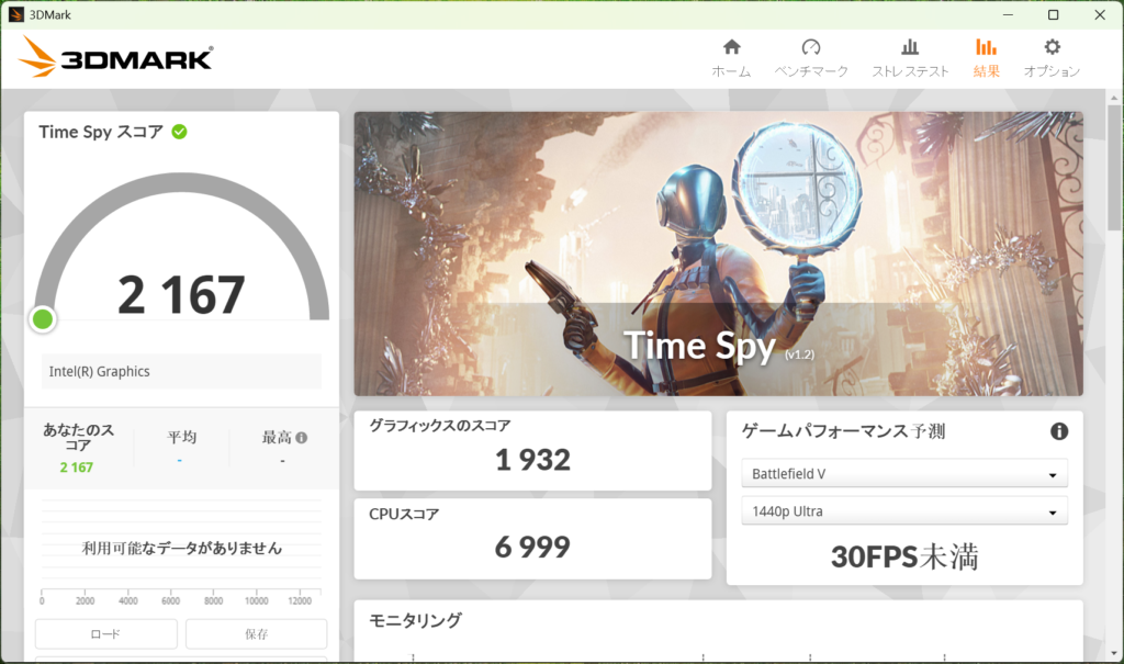 3DMark TimeSpyにおいてはGraphics Scoreが1932ポイントを記録しています。このスコアはデスクトップ向けGPUで言うとGeForce GTX 1050並みであり、Counter StrikeやValorantなどeSports系タイトルでも設定を下げれば動くものの、Apex Legendsなど比較的重いゲームをプレイすることは困難と言えるレベルです。そのため、気休め程度のグラフィクス性能となっています。