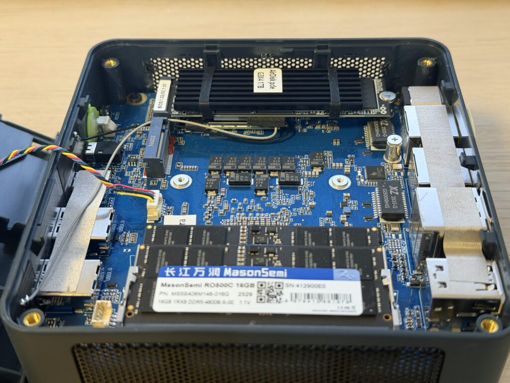 内部はPCIe Gen 4 NVMe SSDに対応するM.2スロットが2本あり、すべて2280タイプに対応しています。また、SO-DIMMスロットでDDR5メモリが搭載されているため、将来的にDDR5価格が安くなり容量を拡大したいと言う場合には自分でアップグレードすることが可能になっています。