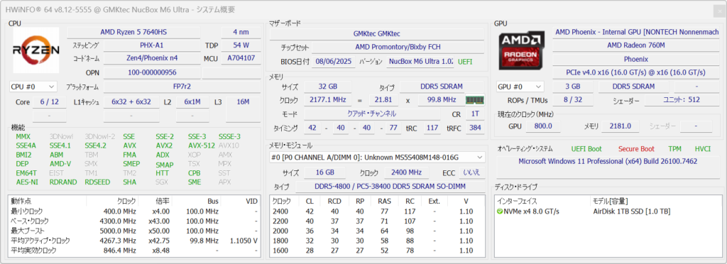 GMKTec NucBox M6 Ultraに内蔵されているCPUはAMDのZen 4世代のRyzen 5 7640HSで、6コア12スレッド構成になっています。