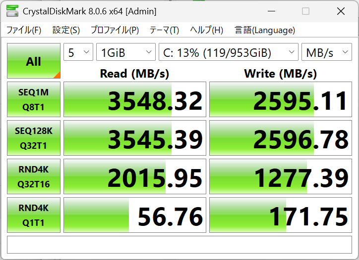 内蔵されているSSDはAirDiskと呼ばれるメーカー製のもので、PCIe Gen 3対応の1TB NVMe SSDを搭載しています。このSSDは公称値は不明ですが、読み取り3500 MB/s、書き込み2600 MB/s程度の速度が出せているため、性能面で不満に思うことは無いです。