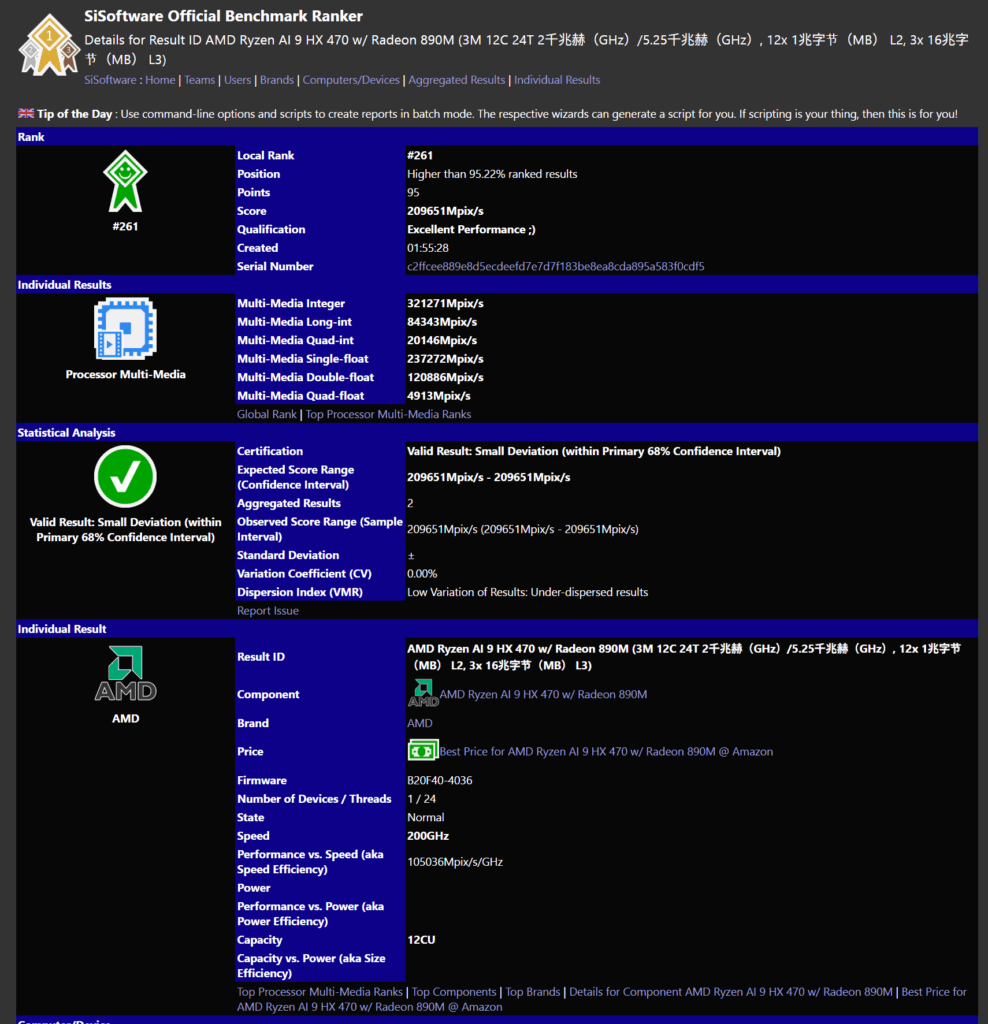 SiSoftwareのベンチマークに登録された製品はRyzen AI 9 HX 470と呼ばれるモデルで、モデル名から現行のRyzen AI 9 HX 370の後継モデルと見られています。