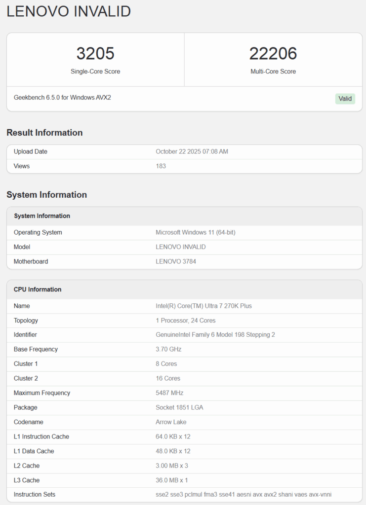 リークされたベンチマークは、Lenovo製OEMシステム上で実施されたものです。DDR5-7200メモリ48GBとGeForce RTX 5090Dが組み合わされた環境で測定されています。Geekbench 6.5.0の結果では、シングルコアが3,205ポイント、マルチコアが22,206ポイントを記録しました。
