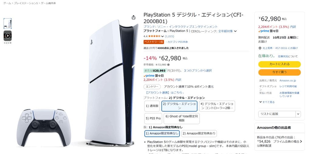 AmazonでPlayStation 5 デジタル・エディションがセール中