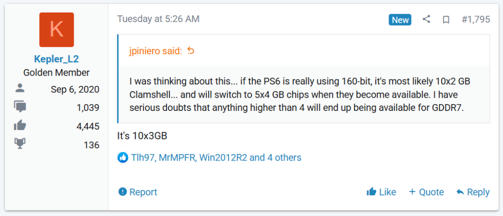 ソニーのPS6を巡っては、2025年9月頃に搭載されるOrion APUのリークが登場しています。この仕様に関するリークの中で、メモリーは160-bitのバス幅で32GbpsのGDDR7を搭載する計画と明らかにされました。一方で実際の容量については最大40GBと漠然としていましたが、リーカーのKepler_L2氏より現在計画されているPS6でのメモリー容量がリークされました。