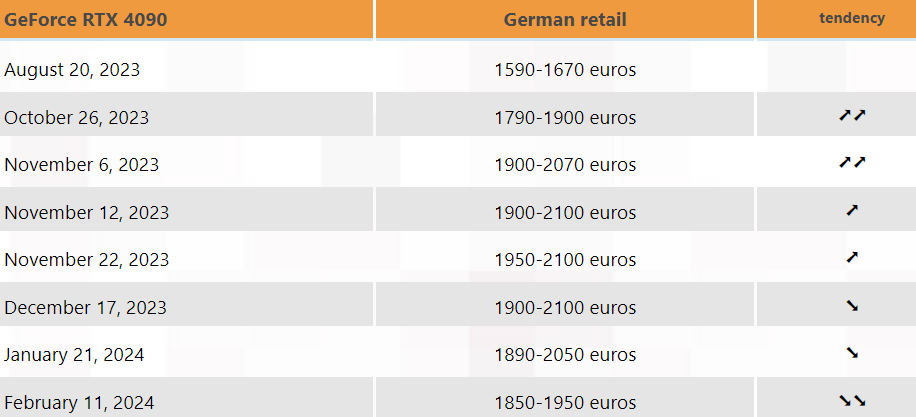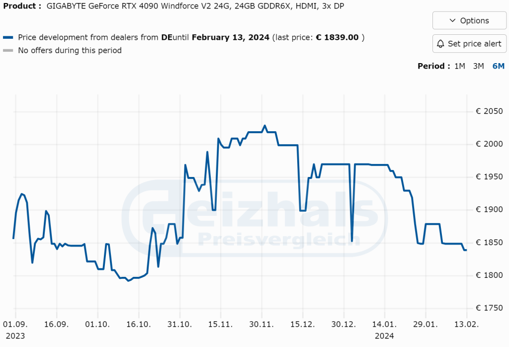 3DCenterの報告によると、RTX 4090の価格は下降傾向が加速しており、3週間前と比べて価格が明らかに下落している様子が確認されています。これはドイツでの価格動向で、2023年8月時点で販売されていた€1,590に比べると未だに€1850と若干高めですが、2023年11月から12月に記録されていた€2000台に比べるとかなり安くなっています。