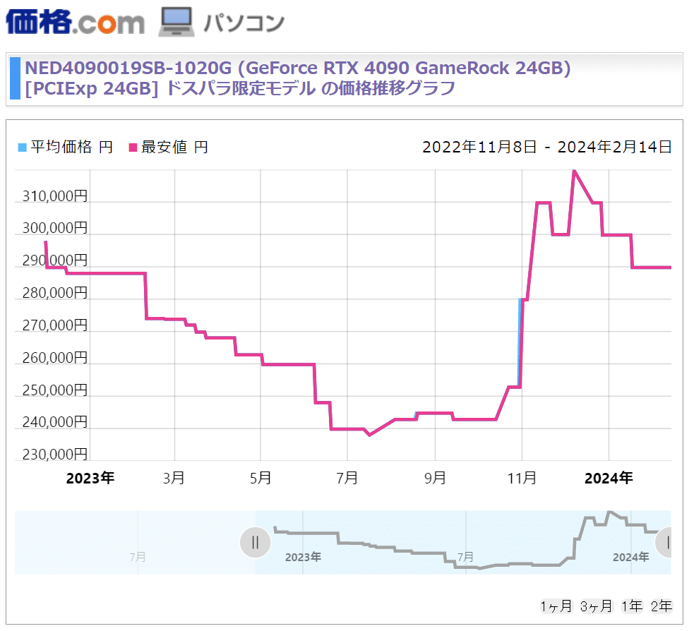 なお、日本での販売価格もピークからは落ち始めており、2023年12月時点では32万円と言う販売価格だったRTX 4090が2024年2月14日時点では29万円と約2か月で3万円程度販売価格が下落しています。