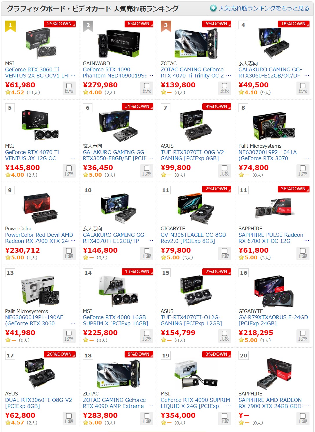 日本ではRTX 4070 Tiが最安値が13~14万円台で販売されている事や、NVIDIAのブランドイメージが高い事も相まって価格.comのランキングを見るとRadeon RX 7900 XTやRX 7900 XTXよりRTX 4070 Tiの方が圧倒的に売れているように見受けられます。