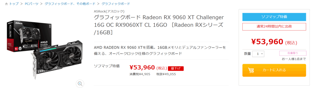 Radeon RX 9060 XT 16GBが53,960円で販売中。8GB版は39,800円に