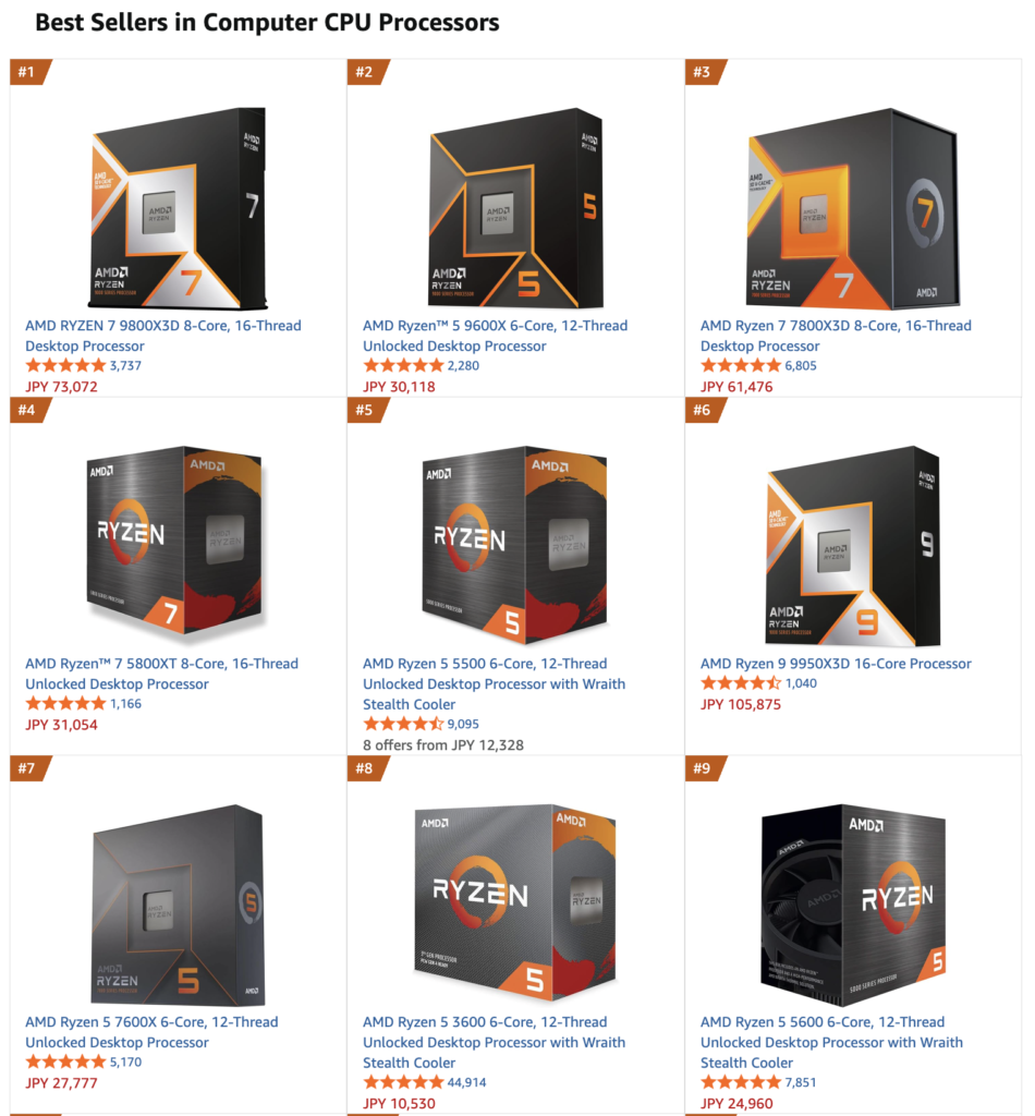 同様の結果は北米でも確認されており、北米Amazonではトップ10のうち4製品がAM4プラットフォームで、トップ20では9製品がAM4対応CPUとなっています。