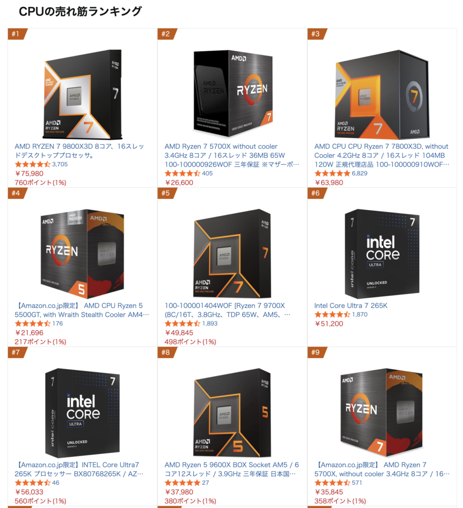 CPUの販売ランキングは、主にRyzen 9000シリーズやCore Ultra 200シリーズなど比較的新しいCPUがランクインする傾向にありました。しかし、直近のAmazonの販売ランキングでは、Ryzen 7 5700Xが2位と9位、Ryzen 5 5500GTが4位と、トップ10の中に3製品がランクインしています。旧世代CPUとしては異例の人気です。