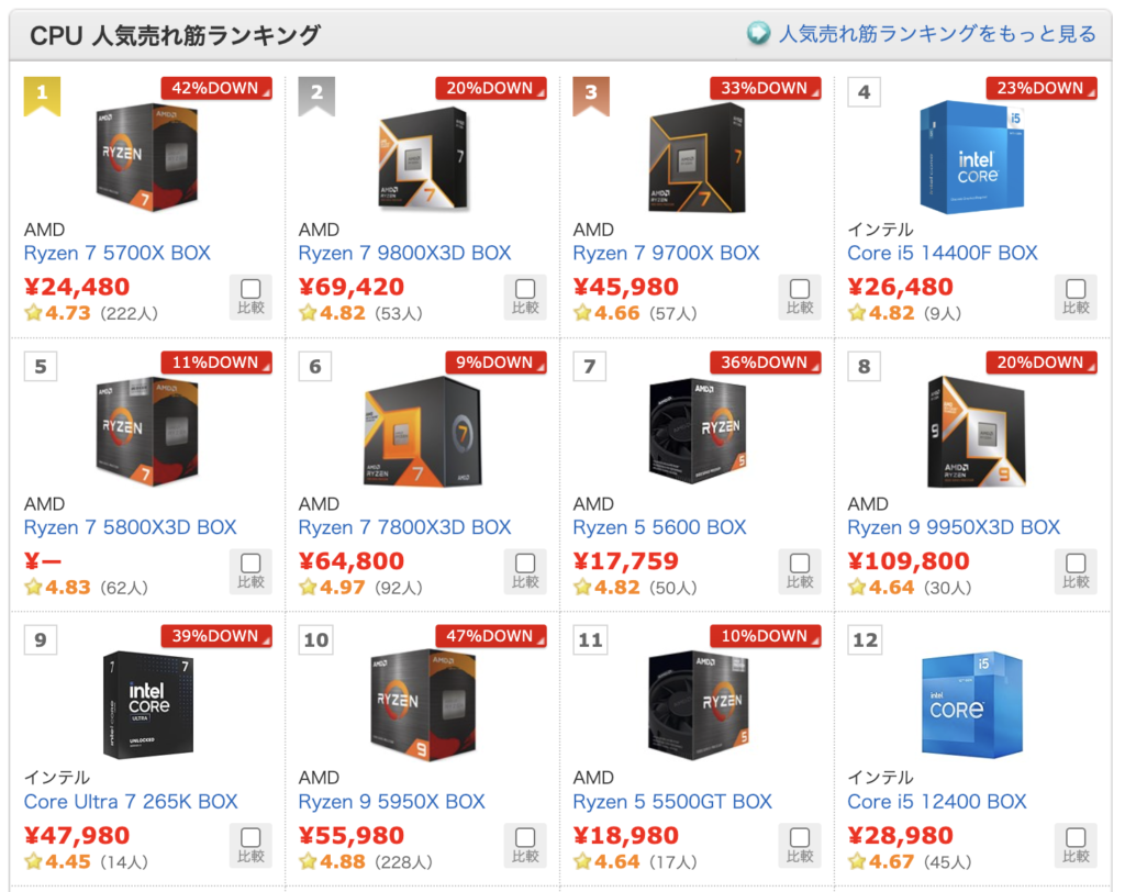 Amazonと同様の傾向は価格.comの販売ランキングでも確認されています。Ryzen 7 5700Xが1番人気で、上位12製品中5製品がRyzen 5000シリーズです。また、Core i5-14400FやCore i5-12400などを含めると、半分以上がDDR4対応CPUとなっています。