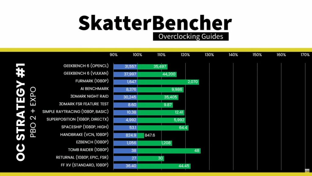 定格状態ではRyzen 7 8700Gの内蔵GPUは最大2.88 GHzで動作し、消費電力は最大50Wでしたが、PBO2+EXPO(DDR5-6400)を有効にすることで動作クロックは2.9 GHzに向上し、平均して15.7%の性能向上が記録されたとのことです。