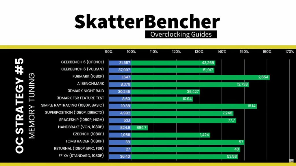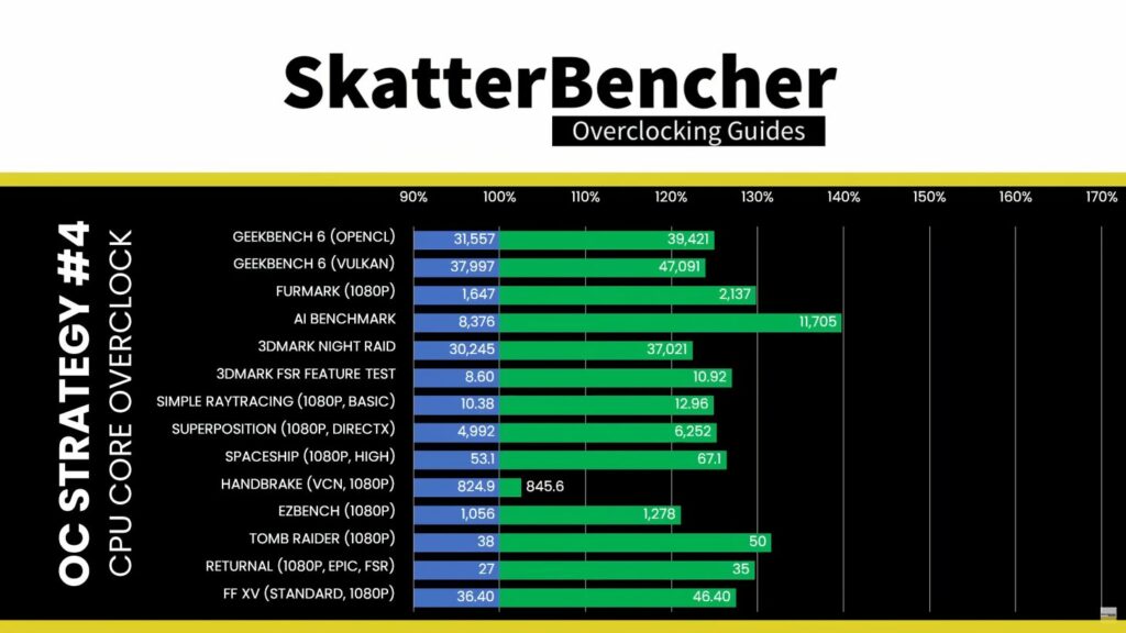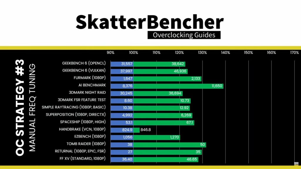 ただ、ここから更に内蔵GPUの動作クロックを3.15 GHzに設定し、メモリーを7800MT/sまで向上させることでベース状態に対してパフォーマンスの平均値は37.8%向上し、個別のスコアに焦点を当てると3D Mark Night Raidは30%、Shadow of The Tomb Raiderでは38FPSから50%増しの57FPS、FF XVは36.4FPSから53.58FPSとプレイが快適と言える60FPSに迫るパフォーマンスを発揮しています。