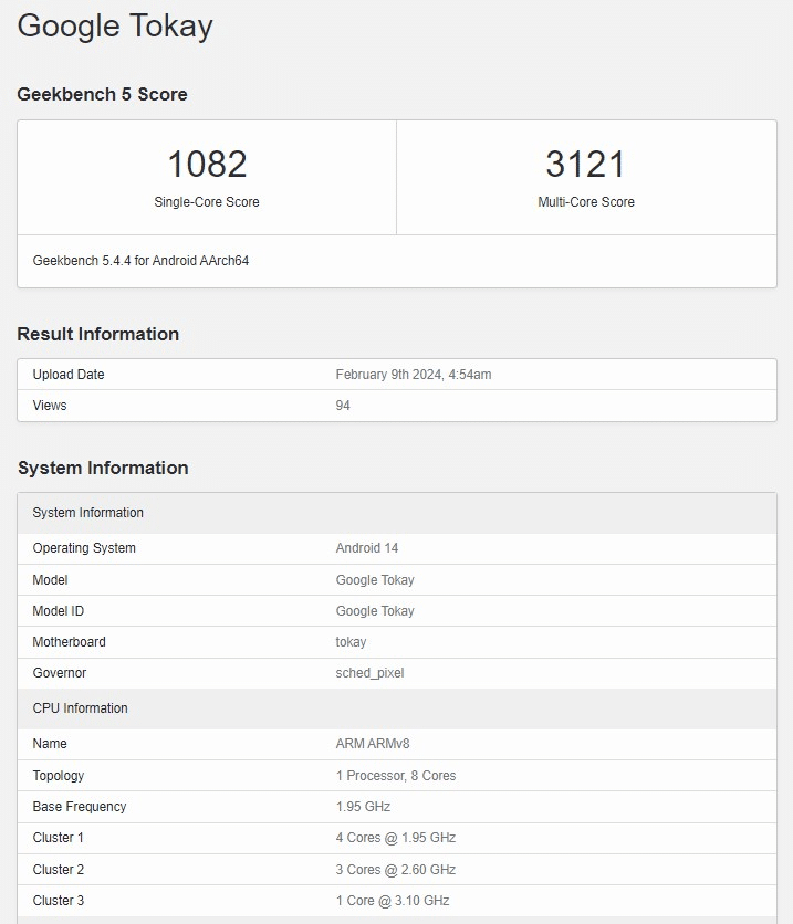 今回出現したGeekbench 5のスコアは試作品と見られるモデルでモデル名はGoogle Tokayと記載されるなどGoogle Pixel端末であると考えられます。このベンチマーク結果に掲載されているSoCの仕様は8コア構成になっており、性能が高いコアから順に1+3+4構成になっています。また、動作クロックは性能が最も高いプライムコアが3.1 GHz、Pコアが2.6 GHz、Eコアが1.95 GHzに設定されています。