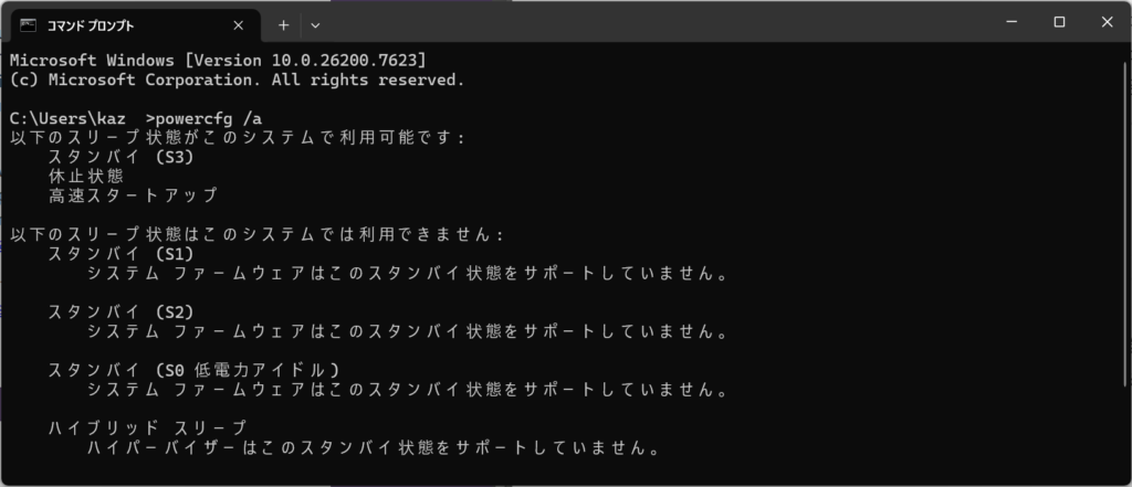 自分のPCがどちらのスリープを使用しているかは、コマンドプロンプトで「powercfg /a」を実行することで確認できます。