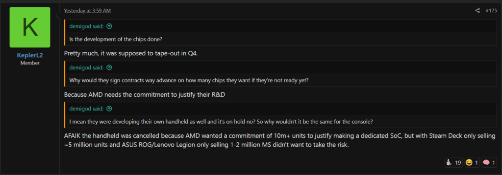 その主な理由として、AMDは専用開発には最低1000万台の発注を要求した一方で、Steam Deckが500万台、ASUS ROGやLenovo Legionなどのハンドヘルドが100~200万台程度しか販売されていない現状があります。このため、Microsoftとしては、AMDからの大規模な違約金発生のリスクを取れなかったようです。