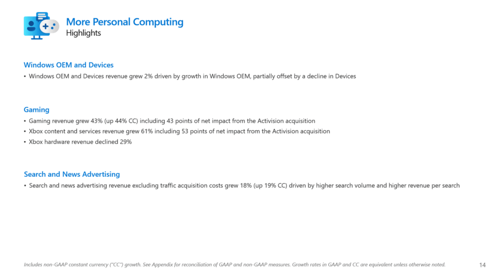 ただ、Microsoftの直近の決算においては、Xboxのハードウェア事業の収益は販売台数の減少が原因で前年比29%の減益を記録しています。一方で、Activisionの買収などによりコンテンツやサービス事業は前年比61%の増益を記録しました。
